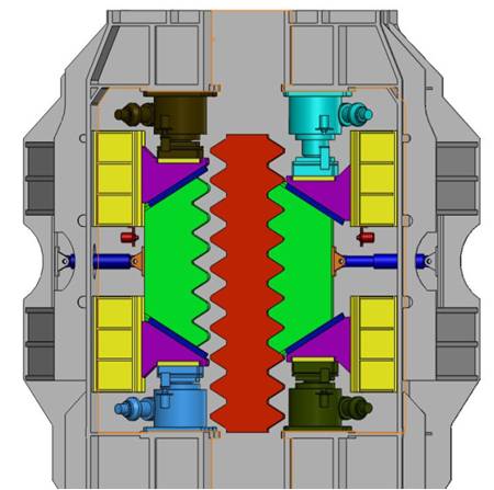 升降系統(tǒng)采用齒輪齒條嚙合原理實現(xiàn)平臺或樁腿的升降操作。安裝在船體的固樁架上,可以采用電機和液壓馬達(dá)驅(qū)動,每一升降單元有爬升齒輪、減速機、電機/液壓馬達(dá)和具有自動保護功能的電磁剎車組成。配有電機控制中心、中央控制臺和樁邊控制柜;鎖緊系統(tǒng)由液壓驅(qū)動,由螺桿升降裝置,鎖緊齒塊,楔塊,油缸和分配器,泵站,樁邊控制柜等組成。