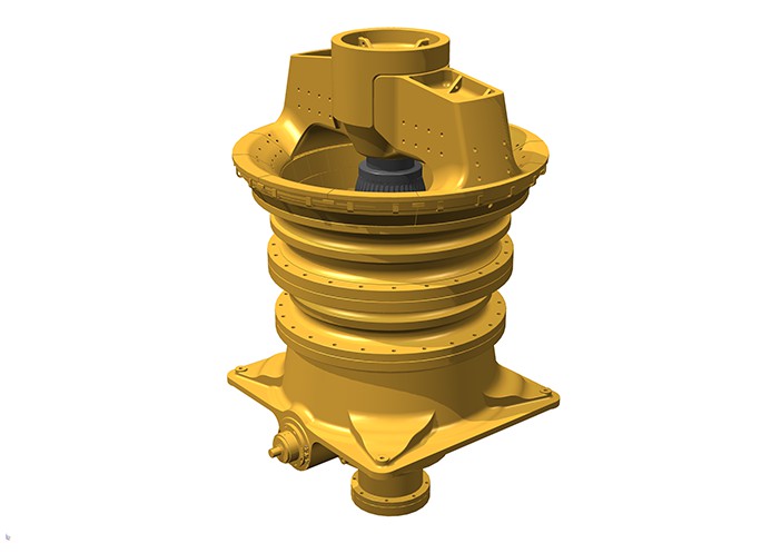 整體式主軸設(shè)計(jì)避免動(dòng)錐松動(dòng)的危險(xiǎn),減少停機(jī)維護(hù)時(shí)間,通過鎖緊螺母鎖緊固定動(dòng)錐襯板,方便動(dòng)錐襯板的更換。
