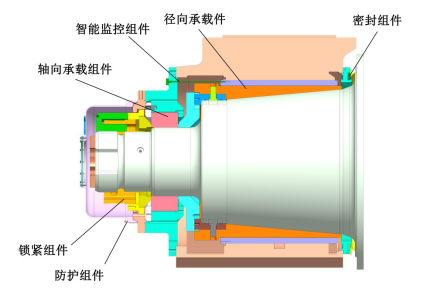 軋機油膜軸承可分為動壓和靜動壓兩種,選型根據(jù)軋機具體工況決定。其油膜軸承結(jié)構(gòu)主要由徑向承載件、軸向承載件、密封組件、鎖緊組件、防護(hù)組件、智能監(jiān)控組件等組成。 徑向承載組件中錐套有無鍵和無鍵薄壁兩種形式,靜動壓襯套有單油腔、雙油腔和四油腔三種形式;軸向承載組件有單止推和雙止推兩種形式;密封組件有JF密封和ACS密封兩種形式;鎖緊組件有機械鎖緊、液壓缸鎖緊兩種形式,用戶可根據(jù)不同需求,各種形式自由組合
