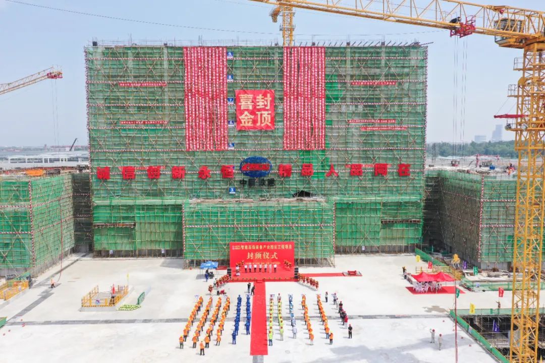 高高矗立,與藍天白云交相輝映,紅布金字的字樣顯得格外矚目。經(jīng)歷9個月的緊張高效施工,運營中心主體結(jié)構(gòu)封頂,標志著新園區(qū)基礎(chǔ)設(shè)施及廠房配套項目建設(shè)取得了重要的階段性勝利,為后續(xù)施工奠定了堅實的基礎(chǔ)。