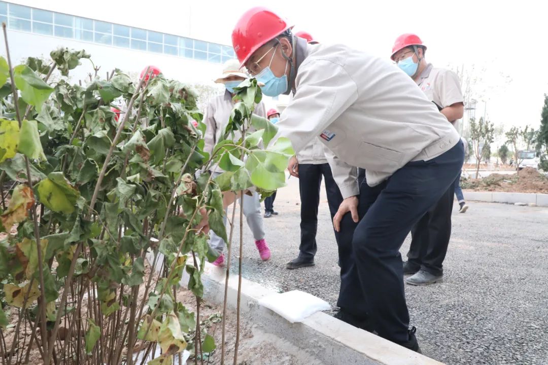 當(dāng)前,廠區(qū)綠化正按照先喬木后灌木再地被的順序超常組織,已有三條道路基本完成主要樹種種植。韓珍堂詳細了解栽種樹木種類布局,指出要合理規(guī)劃,注重細節(jié),不僅要打造品種豐富、四季多彩的園區(qū)景觀,也要注重園區(qū)圍墻外環(huán)境治理,營造優(yōu)美舒適的辦公環(huán)境。要全速推進項目建設(shè),確保各個環(huán)節(jié)銜接有序,在做好道路清理工作的基礎(chǔ)上加快推進綠化工程進度,確保在最佳時節(jié)完成樹木種植工作。