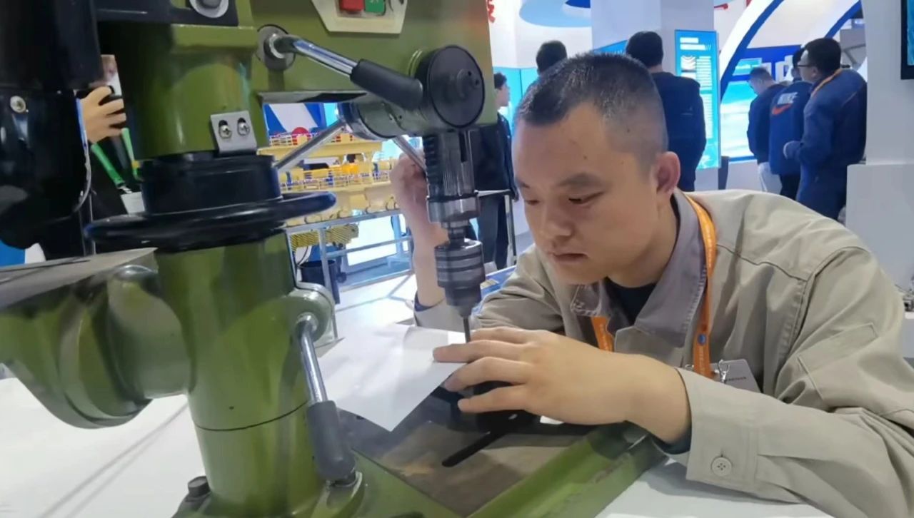 太重的產(chǎn)品模型種類繁多,太重職工也大放異彩!在三晉工匠風(fēng)采展示墻上,集團(tuán)公司職工樊志勤、陳賓兩位勞模工匠的照片引人注目,生動(dòng)展示著太重人的精神面貌和工匠風(fēng)采。齒傳分公司職工單璐還現(xiàn)場展示了技藝絕活,引得參觀者駐足圍觀。大家屏息凝神、目光專注,只見操作者在手機(jī)上放置了一張厚度僅有0.1毫米的A4紙,通過手動(dòng)操作臺(tái)鉆在紙張上精準(zhǔn)地打出了圓孔,但手機(jī)屏幕完好無損,出神入化的技藝贏得了現(xiàn)場觀眾的陣陣掌聲。