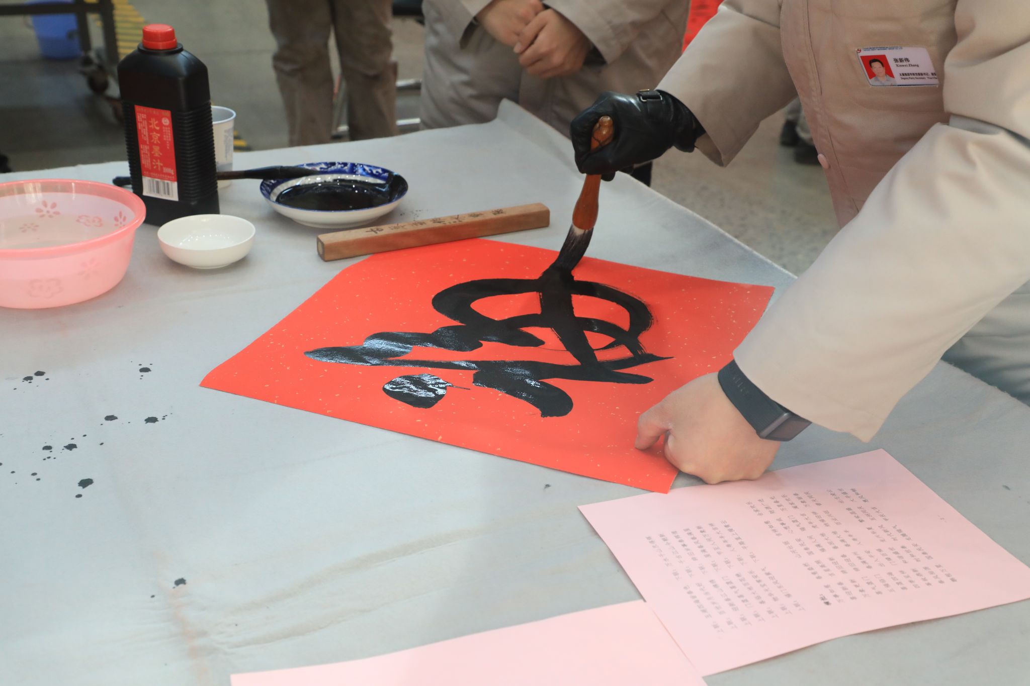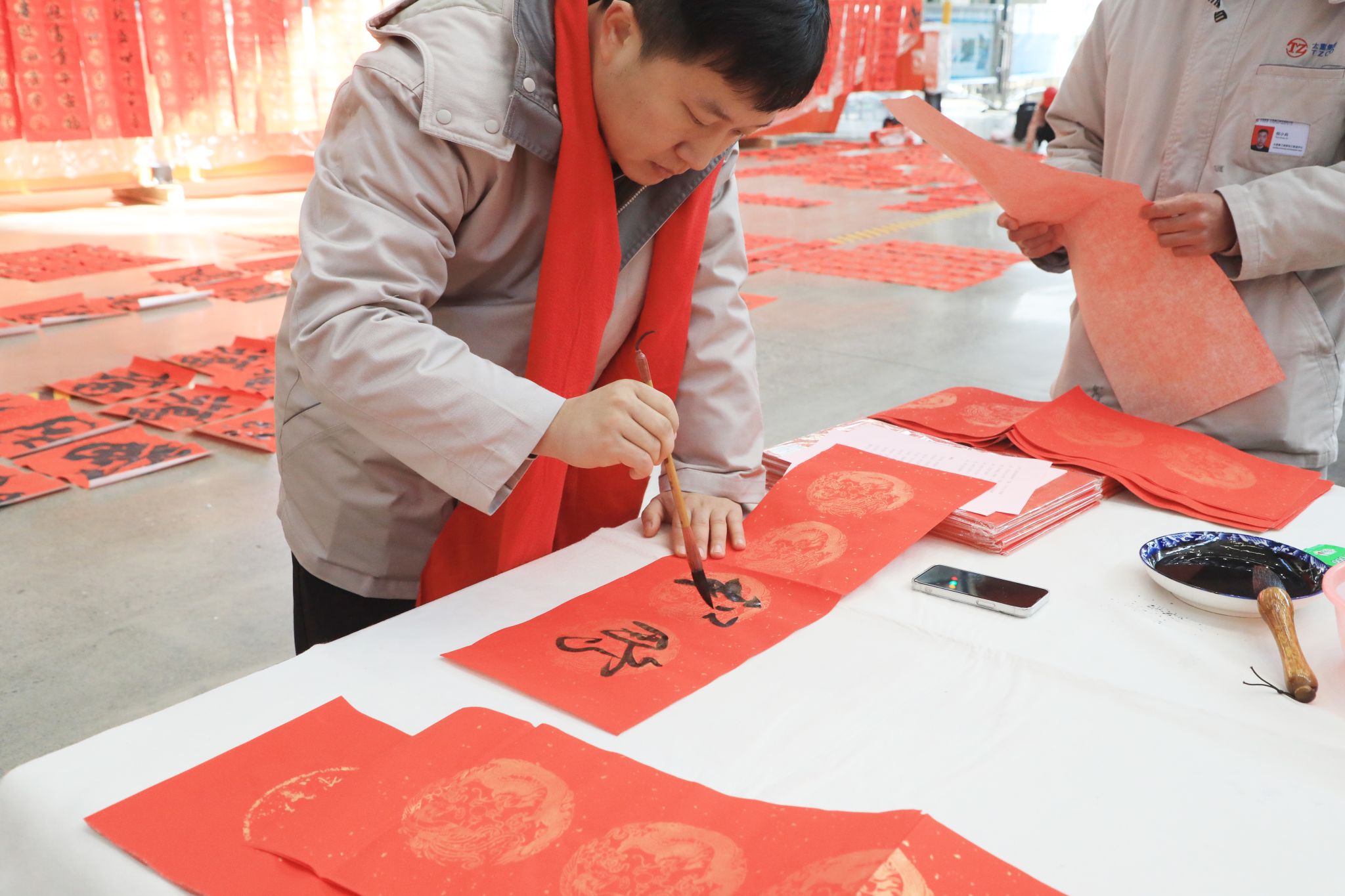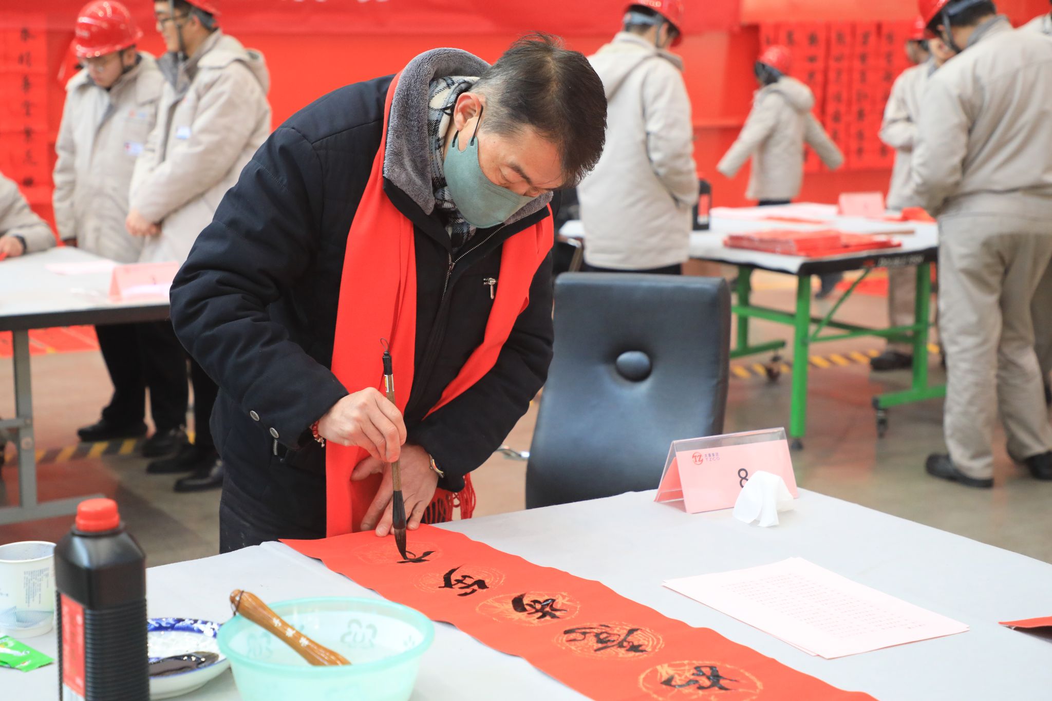 為豐富職工文化生活、喜迎龍年新春,1月23日,公司工會舉辦“迎新春 寫春聯(lián) 送祝福”進(jìn)園區(qū)活動,在太重智能高端裝備產(chǎn)業(yè)園區(qū)加工裝配聯(lián)合廠房,來自省內(nèi)的知名書法家和公司書法愛好者們齊聚一堂,為各子分公司職工義務(wù)書寫春聯(lián),以這種喜慶的形式向廣大干部職工送上春節(jié)的祝福。集團(tuán)公司黨委專職副書記、副董事長、工會主席張新偉參加活動。