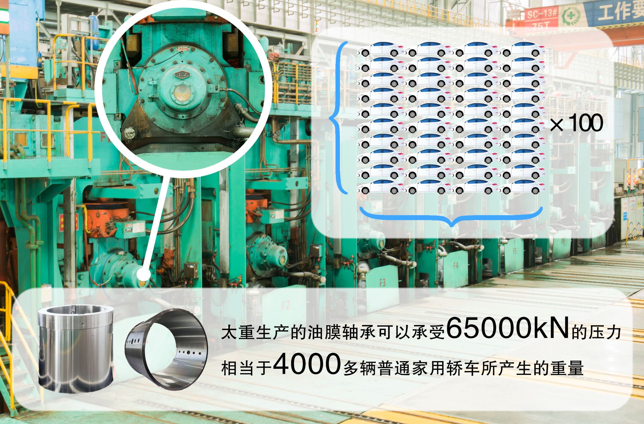 油膜軸承屬于全液體潤滑軸承的范疇,相比其他液體滑動軸承,其所處工況處于低速重載狀態(tài),作為現(xiàn)代軋機的心臟,太重生產(chǎn)的油膜軸承單個就可以承受65000kN(6700t)的壓力,相當于4000多輛普通家用轎車所產(chǎn)生的重量。