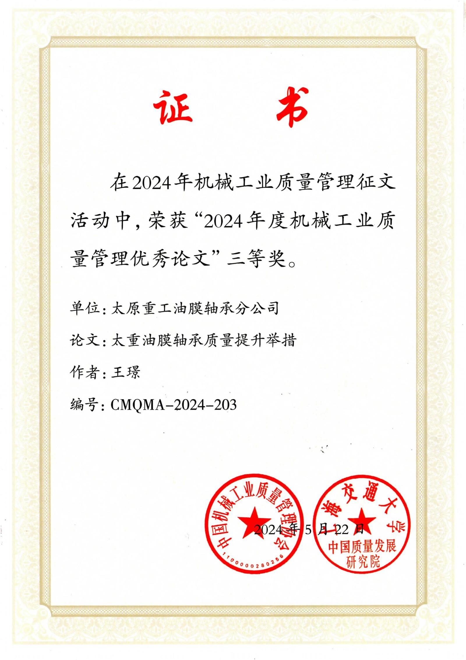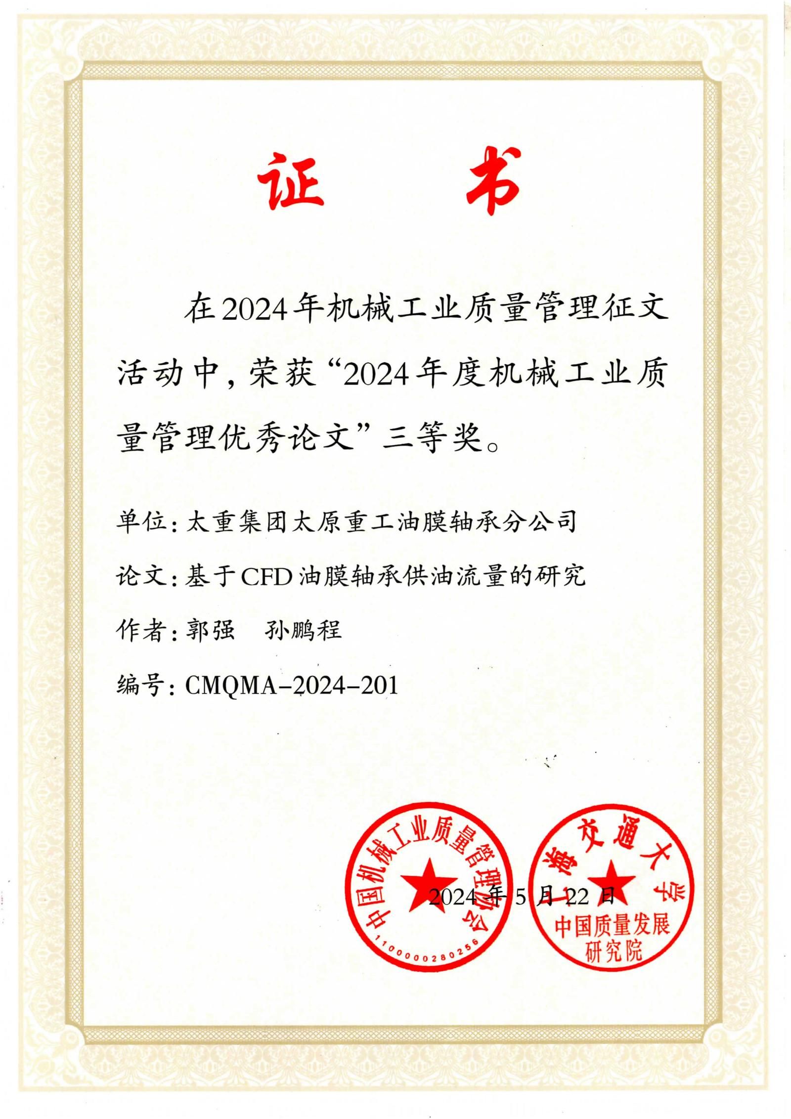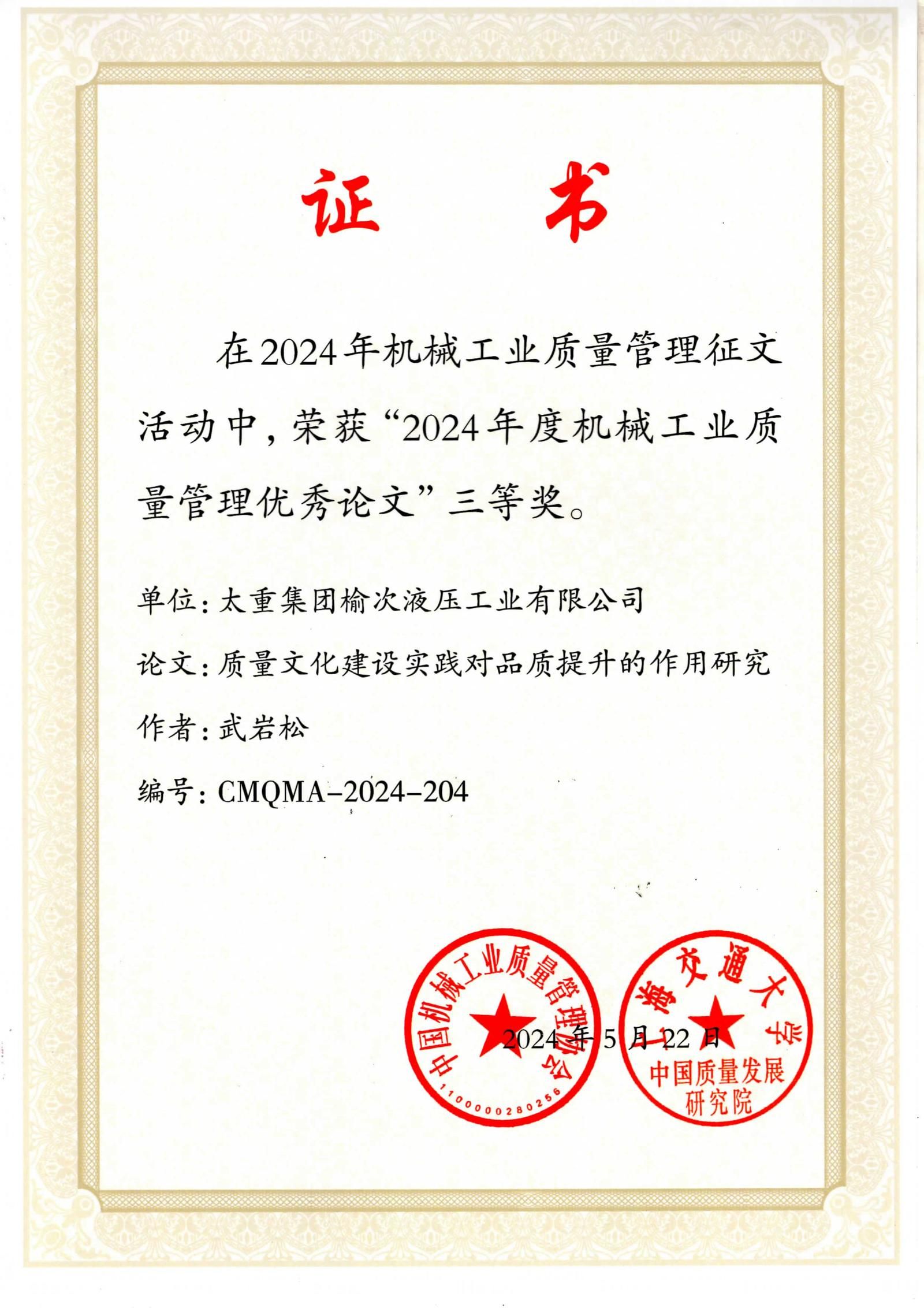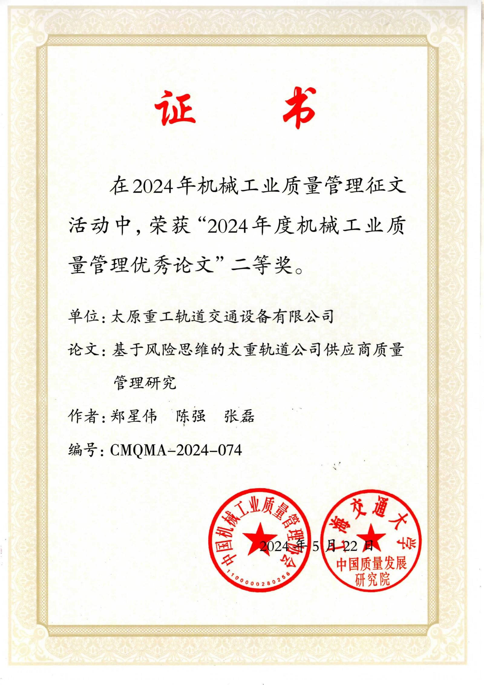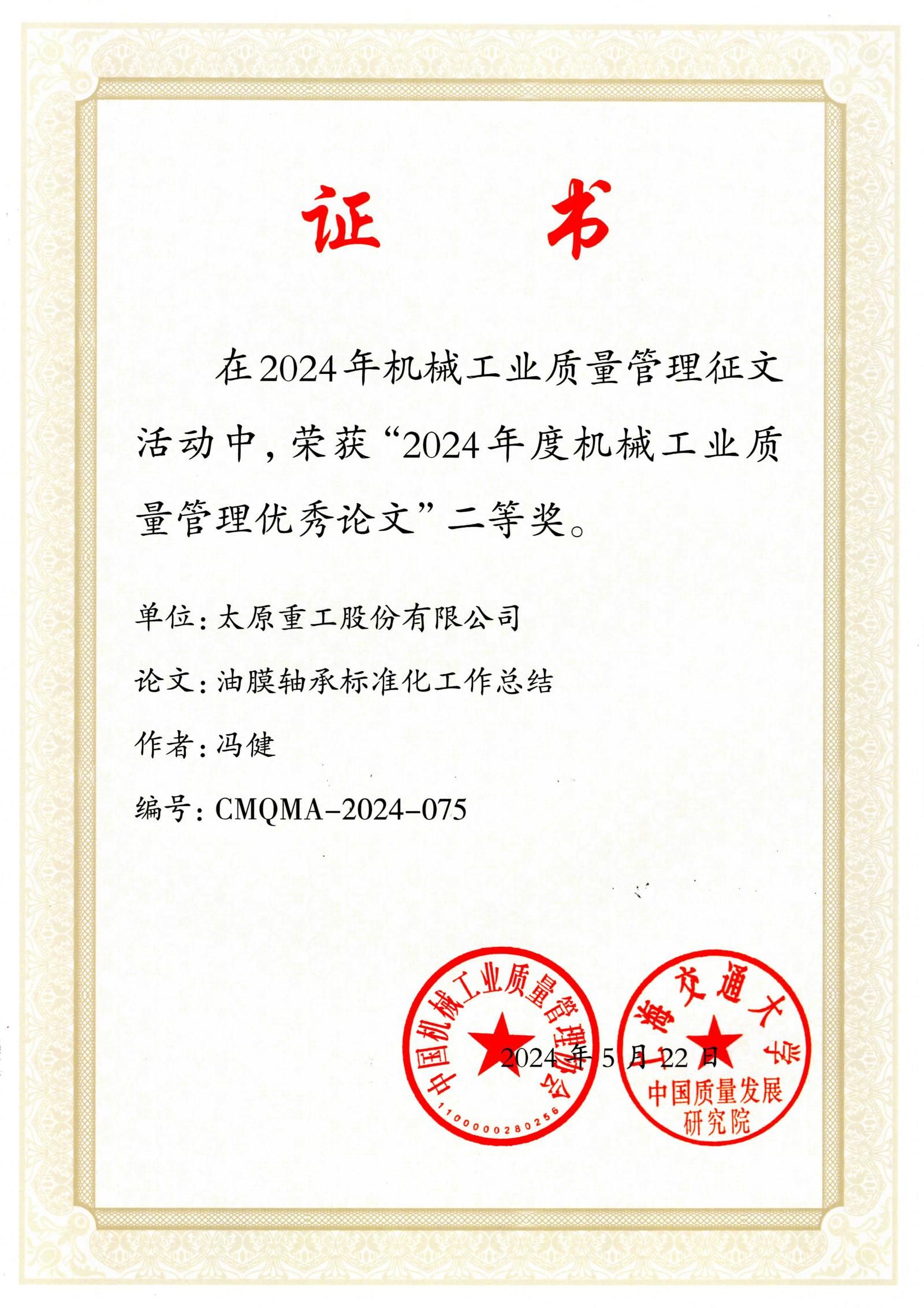 近日,中國(guó)機(jī)械工業(yè)質(zhì)量管理協(xié)會(huì)與上海交通大學(xué)中國(guó)質(zhì)量發(fā)展研究院聯(lián)合發(fā)布了“關(guān)于表彰機(jī)械工業(yè)質(zhì)量管理優(yōu)秀論文的決定”。在這次備受關(guān)注的評(píng)選中,太重集團(tuán)憑借卓越的質(zhì)量管理研究與實(shí)踐成果,榮獲3項(xiàng)二等獎(jiǎng)和4項(xiàng)三等獎(jiǎng)。