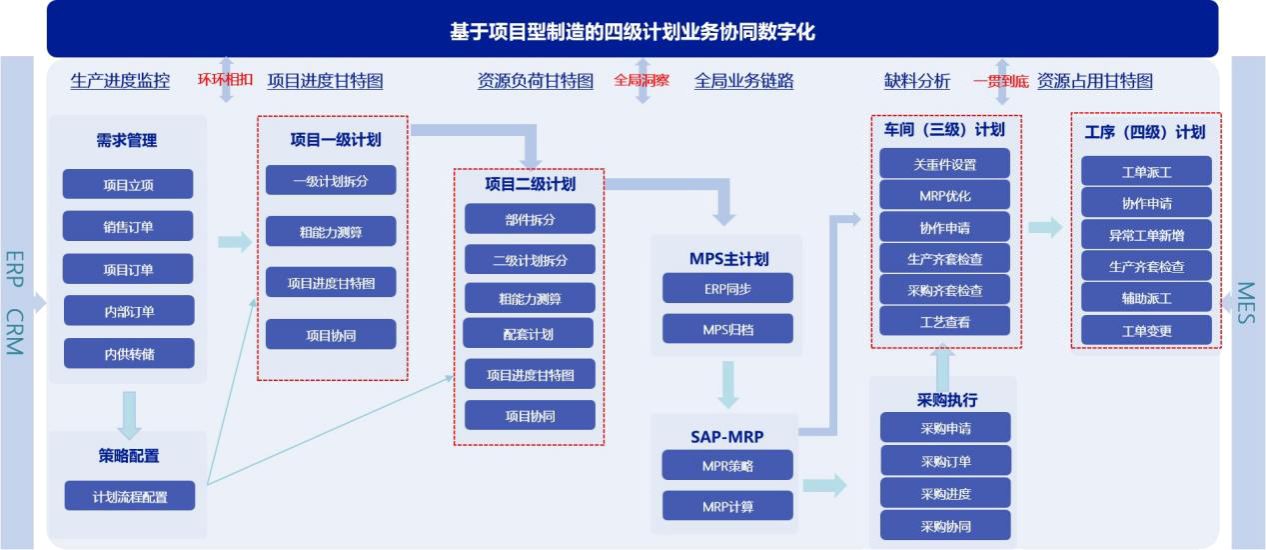 太重MOM平臺(tái),通過引入數(shù)字化手段,構(gòu)建了一個(gè)橫跨制造管理、生產(chǎn)單元、采購配套等多業(yè)務(wù)環(huán)節(jié)的綜合管理系統(tǒng)。該系統(tǒng)采用了分級(jí)計(jì)劃管理模式,結(jié)合倒排和順排計(jì)劃方式,形成了“橫向到邊、縱向到底”的四級(jí)計(jì)劃體系。一級(jí)項(xiàng)目計(jì)劃關(guān)注產(chǎn)品從設(shè)計(jì)、工藝、采購、生產(chǎn)、發(fā)運(yùn)到安調(diào)等全過程的節(jié)點(diǎn)控制;二級(jí)大部件計(jì)劃則根據(jù)一級(jí)計(jì)劃的節(jié)點(diǎn)要求,結(jié)合生產(chǎn)經(jīng)驗(yàn)和產(chǎn)能評(píng)估數(shù)據(jù),設(shè)定大部件各工序的完成節(jié)點(diǎn);三級(jí)零部件生產(chǎn)計(jì)劃和四級(jí)工序任務(wù)計(jì)劃聚焦零部件級(jí)別的生產(chǎn)執(zhí)行,依據(jù)ERP系統(tǒng)輸出的生產(chǎn)訂單,進(jìn)行生產(chǎn)派工、調(diào)度、執(zhí)行等實(shí)際業(yè)務(wù)操作。這四層計(jì)劃緊密相連,不僅提升了項(xiàng)目型制造的生產(chǎn)運(yùn)營管理效率,還實(shí)現(xiàn)了生產(chǎn)計(jì)劃的精細(xì)化管理和高效協(xié)同。