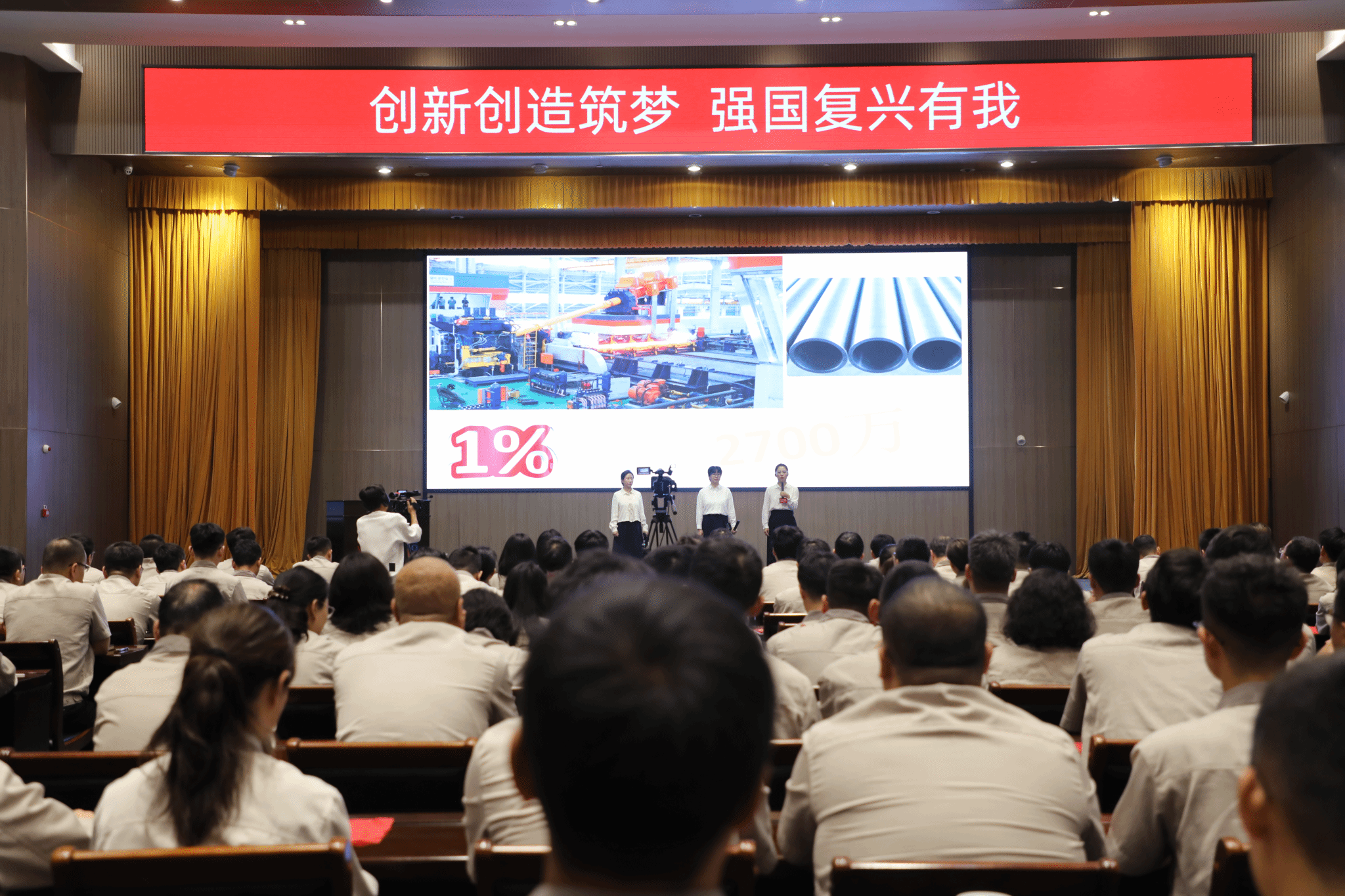 我是來自技術(shù)中心的裴丁璞。黨的二十屆三中全會把科技創(chuàng)新放置于前所未有的突出位置,中國式現(xiàn)代化關(guān)鍵在科技現(xiàn)代化。在今年全國科技大會上,習(xí)近平總書記勉勵(lì)科技工作者,要以“十年磨一劍”的堅(jiān)定決心和頑強(qiáng)意志,只爭朝夕、埋頭苦干,一步一個(gè)腳印把科技強(qiáng)國這一戰(zhàn)略目標(biāo)變?yōu)楝F(xiàn)實(shí)。憶往昔,錢學(xué)森長空鑄劍,用蒼茫大漠點(diǎn)綴了蘑菇云的硝煙,護(hù)佑祖國千秋萬代;看今朝,袁隆平稻田筑夢,用一粒種子維護(hù)了全球糧食安全,燭照后人前行之路!在我們技術(shù)中心,有這樣一支最強(qiáng)女團(tuán),她們整日與“鋼鐵猛獸”相伴,在軋鋼技術(shù)的最前沿不斷探索、矢志創(chuàng)新,用實(shí)際行動詮釋了“科技強(qiáng)國”的深刻內(nèi)涵,被大家稱為“三劍客”,她們就是郝志紅、石媚杰、張力。今天,她們想以工程師的視角講講自己眼中的科技創(chuàng)新。