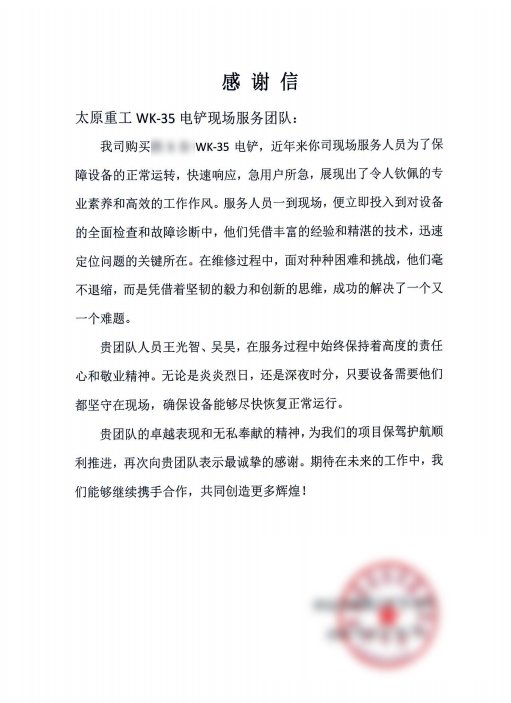 熱忱的服務(wù)態(tài)度和精湛的技術(shù)水平深受用戶贊賞:“方向準(zhǔn)、行動(dòng)快、效果實(shí)!我們見(jiàn)證了太重速度,體會(huì)了太重服務(wù),讓人十分信賴?!庇脩舳啻卧诂F(xiàn)場(chǎng)感慨道。帶著感情去工作,帶著責(zé)任去執(zhí)行。每一封感謝信與每一面錦旗,都流露出用戶對(duì)公司卓越服務(wù)的認(rèn)可與贊譽(yù)。未來(lái),公司將不斷加大后市場(chǎng)的服務(wù)力度,優(yōu)化服務(wù)流程、提升服務(wù)質(zhì)量、提供最優(yōu)解決方案,以超預(yù)期的服務(wù)與價(jià)值持續(xù)加強(qiáng)產(chǎn)品核心競(jìng)爭(zhēng)力。