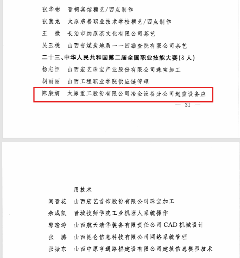 近日,山西省人民政府印發(fā)《關(guān)于授予2022—2023年度職業(yè)技能競賽優(yōu)秀選手“三晉技術(shù)能手”稱號的決定》,來自太重冶金設(shè)備分公司的行車工陳康妍榜上有名!