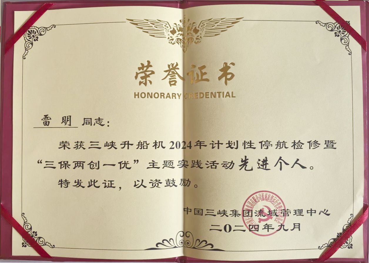 在三峽升船機(jī)2024年計(jì)劃性停航檢修項(xiàng)目總結(jié)大會上,公司服務(wù)人員雷明被評為“先進(jìn)個(gè)人”稱號。這是他在2023年獲得用戶表彰后,連續(xù)第二年斬獲此項(xiàng)榮譽(yù)!爭分奪秒保工期,不遺余力趕進(jìn)度。本次檢修是三峽升船機(jī)通航以來的第四次停航檢修,為期35天,工期緊、任務(wù)重、難度高、風(fēng)險(xiǎn)大,為確保如期完成檢修任務(wù),太重榆液精心組織、周密安排,積極做好人員、檢修工器具、材料及設(shè)備設(shè)施等各項(xiàng)準(zhǔn)備工作,針對本次檢修的重難點(diǎn)制定了切實(shí)可行的專項(xiàng)施工方案和安全方案。在施工過程中,公司合理組織調(diào)配資源,落實(shí)技術(shù)細(xì)節(jié)要求,圓滿高效地完成了各項(xiàng)檢修任務(wù),質(zhì)量、安全、進(jìn)度均達(dá)到要求,“太重速度”為我國三峽項(xiàng)目的平穩(wěn)運(yùn)行再立新功!