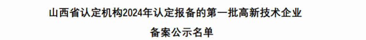 近日,全國高新技術企業(yè)認定管理工作領導小組辦公室,正式發(fā)布《對山西省認定機構2024年認定報備的第一批高新技術企業(yè)進行備案的公告》。