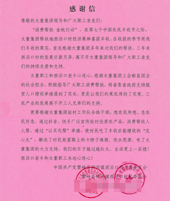 紙箋傳心意,溫情暖寒冬。近日,公司收到一份暖心的“禮物”,一封來自繁峙縣砂河鎮(zhèn)西沿口村支部委員會的感謝信。信中對公司積極開展消費幫扶,用心用情用力解決定點幫扶村農(nóng)特產(chǎn)品銷售難題,促進(jìn)農(nóng)民群眾增收表示感謝。