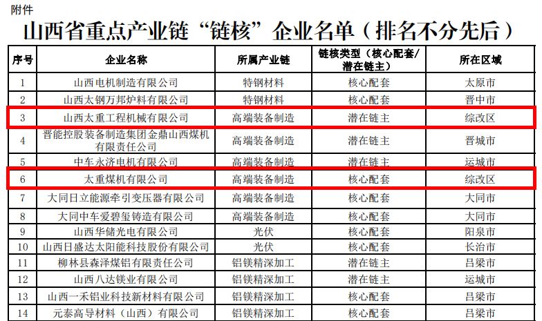 近日,在山西省工業(yè)和信息化廳最新發(fā)布的關(guān)于山西省重點(diǎn)產(chǎn)業(yè)鏈“鏈核”企業(yè)名單中,山西太重工程機(jī)械有限公司與太重煤機(jī)有限公司分別入選高端裝備制造“潛在鏈主”與“核心配套”企業(yè),彰顯了太重在產(chǎn)業(yè)鏈建設(shè)上的強(qiáng)大實(shí)力。