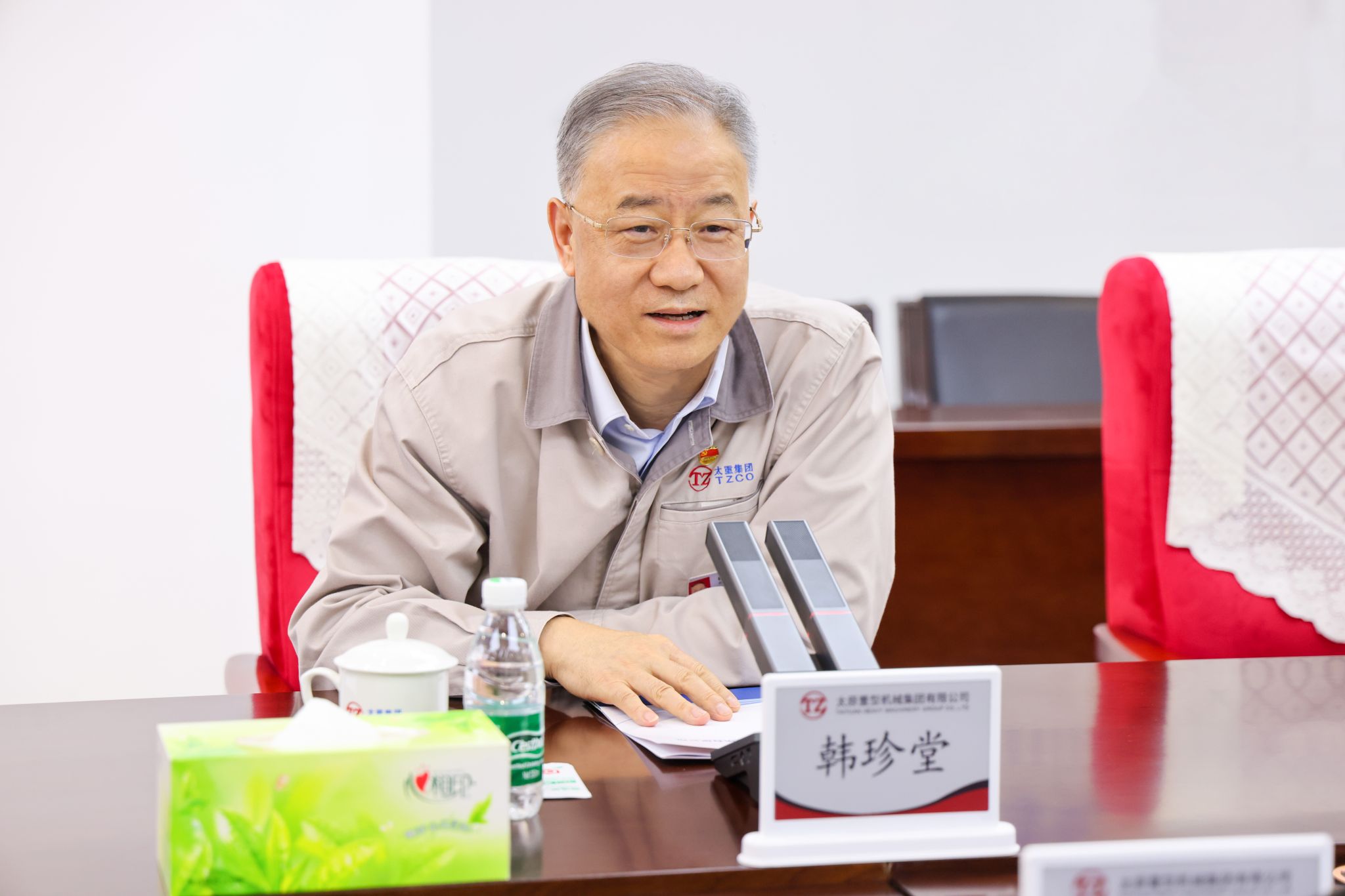 韓珍堂對高峰一行的到來表示熱烈歡迎,并詳細(xì)介紹了太重的發(fā)展歷程、企業(yè)文化以及未來發(fā)展規(guī)劃。他說,太重作為“共和國長子”,肩負(fù)大國重器的使命擔(dān)當(dāng),與祖國同向同行。轉(zhuǎn)型升級以來,太重開啟了氣勢如虹的改革、創(chuàng)新和發(fā)展,進(jìn)入了追趕超越的新階段,正逐步向創(chuàng)造引領(lǐng)不斷前行。近年來,太重持續(xù)加大研發(fā)投入,構(gòu)建起“一重點、一中心、多基地”技術(shù)研發(fā)體系,創(chuàng)新優(yōu)勢不斷轉(zhuǎn)化為發(fā)展勝勢,以“高端化、智能化、綠色化、國產(chǎn)化”為產(chǎn)品定位,不斷推陳出新,越來越多的用戶用上了國產(chǎn)化精品。同時,太重堅持全球化戰(zhàn)略和國際化視野,深入推進(jìn)國內(nèi)外重點區(qū)域公司和維護(hù)中心建設(shè),推動太重品牌揚帆出海。未來,希望能與太鋼進(jìn)一步開展多層次、寬領(lǐng)域合作,充分利用行業(yè)領(lǐng)先技術(shù)和地域優(yōu)勢,“一南一北”協(xié)同配合,深度合作推動山西制造業(yè)高質(zhì)量發(fā)展,為譜寫中國式現(xiàn)代化山西篇章作出更大貢獻(xiàn)。