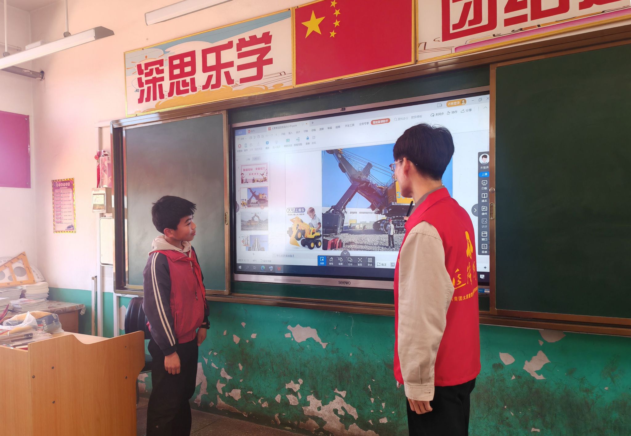 在妙趣橫生的科普課堂上,青年志愿者以動畫形式向學生展示太重大型礦用挖掘機等“國之重器”,太重AI數智人還用童言童語講述智能裝備的“超級輪胎”與“智慧大腦”,點燃孩子們的科技熱情?!疤珔柡α耍@就和我心目中的‘超級英雄’一樣!”學生稚嫩的話語里,充滿著贊嘆?!?2秒一個車輪”“8分48秒一臺挖掘機”“一鍵煉焦”……青年志愿者們用生動的事例串起太重人勇攀高峰的優(yōu)異成績,將這份記憶帶給新時代少年。