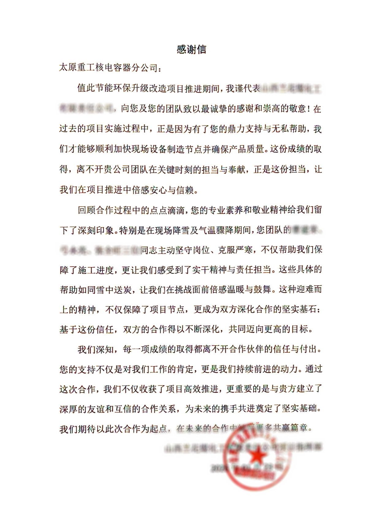“堅守崗位、克服嚴(yán)寒,讓我們感受到了實干精神與責(zé)任擔(dān)當(dāng)。”近日,太重核電分公司收到來自用戶的感謝信。字里行間,點贊滿滿,對在尾氣洗滌塔施工項目中,展現(xiàn)敬業(yè)精神的太重制造團隊高度贊揚。