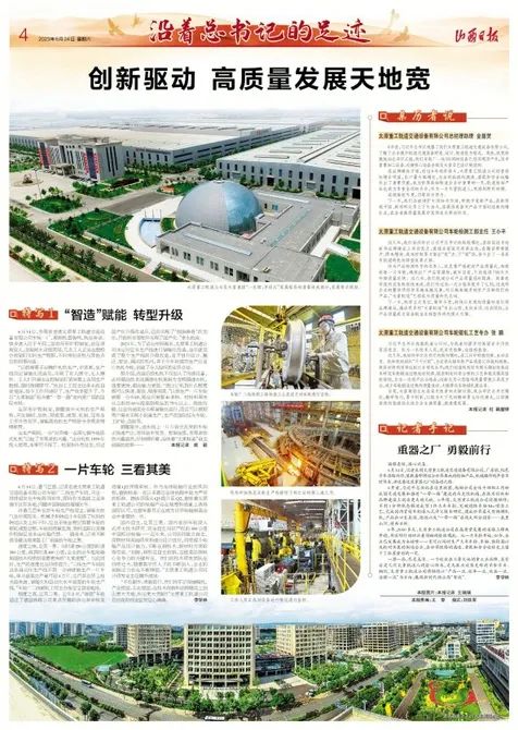 6月24日,山西日報頭版及四版整版多篇報道紛紛聚焦太重集團,深入報道了在習(xí)近平總書記考察調(diào)研太重六年間的巨大變化。太重集團在高質(zhì)量發(fā)展的道路上蹄疾步穩(wěn),用實際行動回應(yīng)著領(lǐng)袖的殷殷囑托。作為省內(nèi)唯一“雙鏈主”企業(yè),太重不斷加大科研投入力度,在突破關(guān)鍵核心技術(shù)、促進產(chǎn)業(yè)轉(zhuǎn)型升級的最前沿業(yè)績突出,蔚然形成千帆奮競、全面創(chuàng)新的生動局面,受到了主流媒體的關(guān)注。