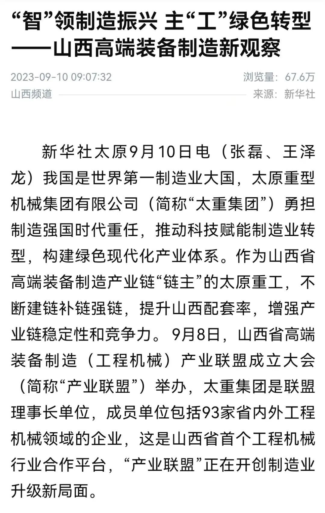 我國是世界第一制造業(yè)大國,太原重型機(jī)械集團(tuán)有限公司(簡稱“太重集團(tuán)”)勇?lián)圃鞆?qiáng)國時代重任,推動科技賦能制造業(yè)轉(zhuǎn)型,構(gòu)建綠色現(xiàn)代化產(chǎn)業(yè)體系。作為山西省高端裝備制造產(chǎn)業(yè)鏈“鏈主”的太重集團(tuán),不斷建鏈補(bǔ)鏈強(qiáng)鏈,提升山西配套率,增強(qiáng)產(chǎn)業(yè)鏈穩(wěn)定性和競爭力。9月8日,山西省高端裝備制造(工程機(jī)械)產(chǎn)業(yè)聯(lián)盟成立大會(簡稱“產(chǎn)業(yè)聯(lián)盟”)舉辦,太重集團(tuán)是聯(lián)盟理事長單位,成員單位包括93家省內(nèi)外工程機(jī)械領(lǐng)域的企業(yè),這是山西省首個工程機(jī)械行業(yè)合作平臺,“產(chǎn)業(yè)聯(lián)盟”正在開創(chuàng)制造業(yè)升級新局面。