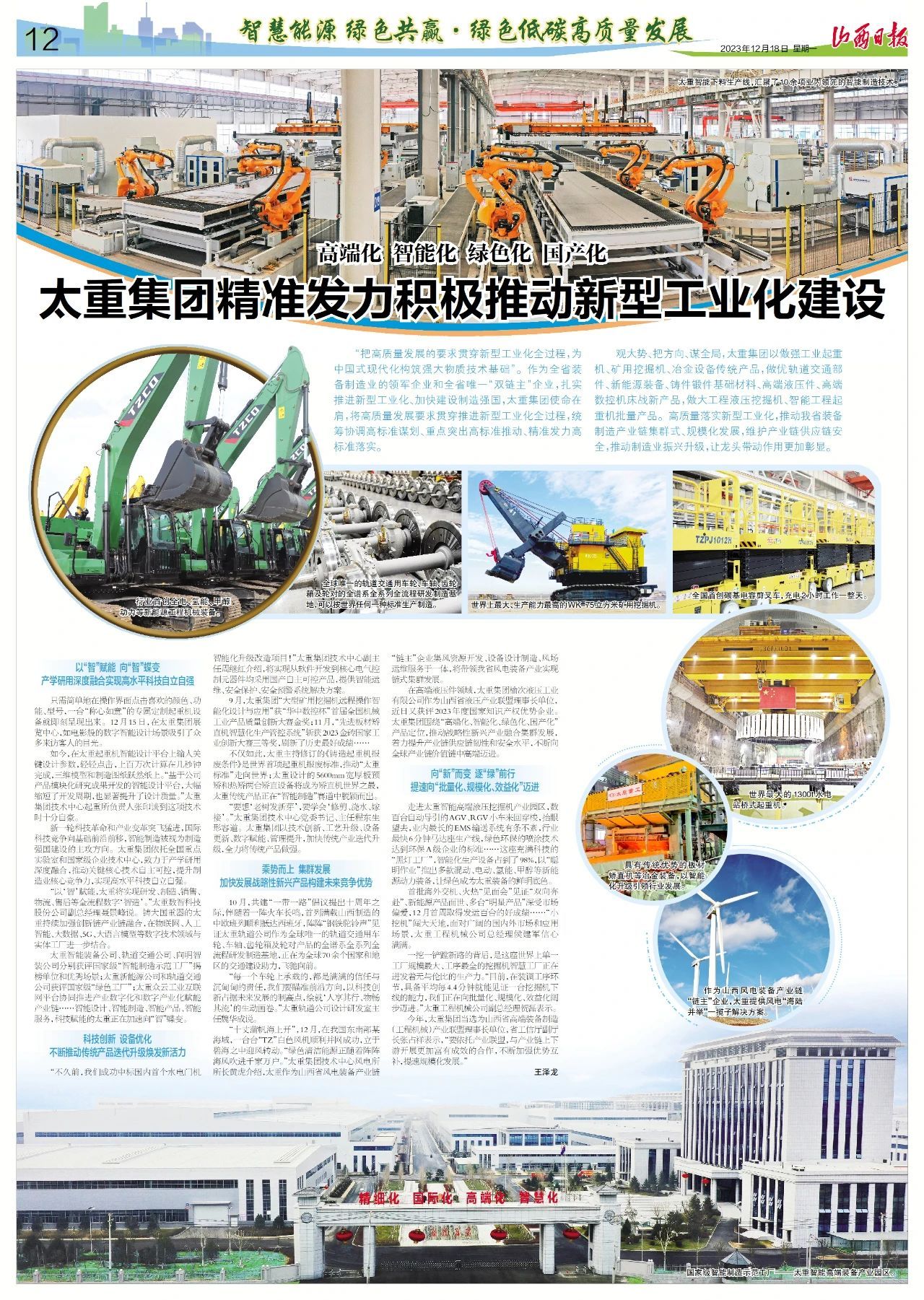 今日,山西日報整版刊發(fā)《高端化 智能化 綠色化 國產(chǎn)化 太重集團精準發(fā)力積極推動新型工業(yè)化建設(shè)》文章,從產(chǎn)學(xué)研用深度融合、傳統(tǒng)產(chǎn)品迭代升級、加快發(fā)展戰(zhàn)略性新興產(chǎn)品、打造綠色批量裝備等方面,詳細報道太重高質(zhì)量落實新型工業(yè)化的生動實踐,講述公司作為全省唯一“雙鏈主”企業(yè),持續(xù)推動我省裝備制造產(chǎn)業(yè)鏈集群式、規(guī)?;l(fā)展的務(wù)實之舉。