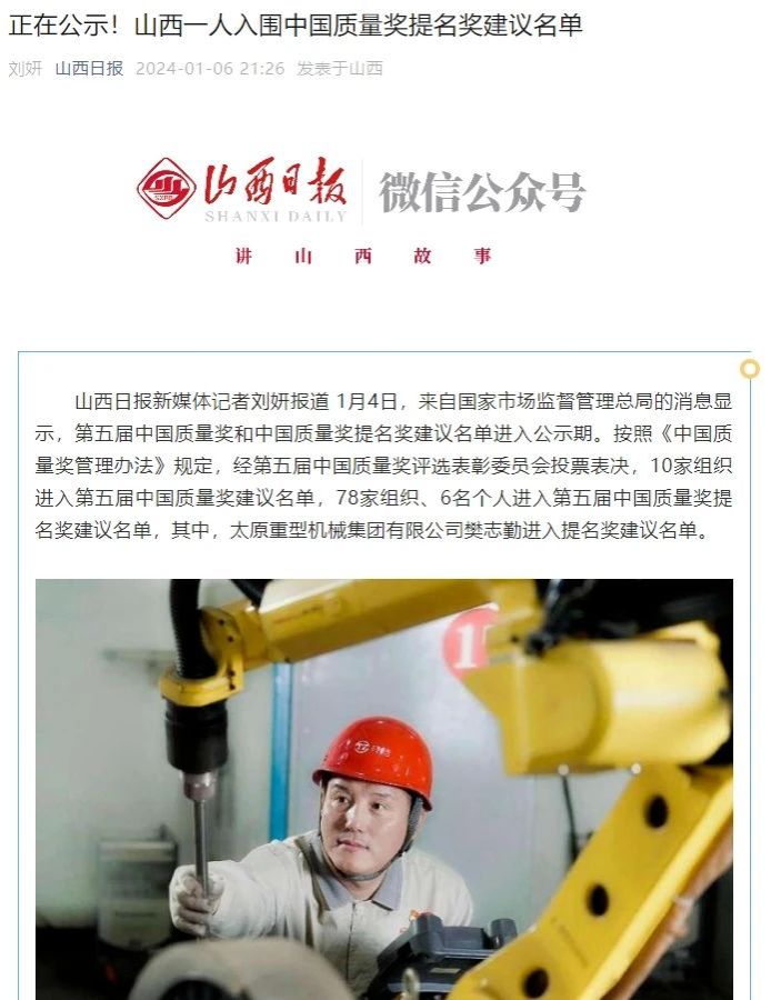 1月4日,來自國家市場監(jiān)督管理總局的消息顯示,第五屆中國質量獎和中國質量獎提名獎建議名單進入公示期。按照《中國質量獎管理辦法》規(guī)定,經第五屆中國質量獎評選表彰委員會投票表決,10家組織進入第五屆中國質量獎建議名單,78家組織、6名個人進入第五屆中國質量獎提名獎建議名單,其中,太原重型機械集團有限公司樊志勤進入提名獎建議名單。