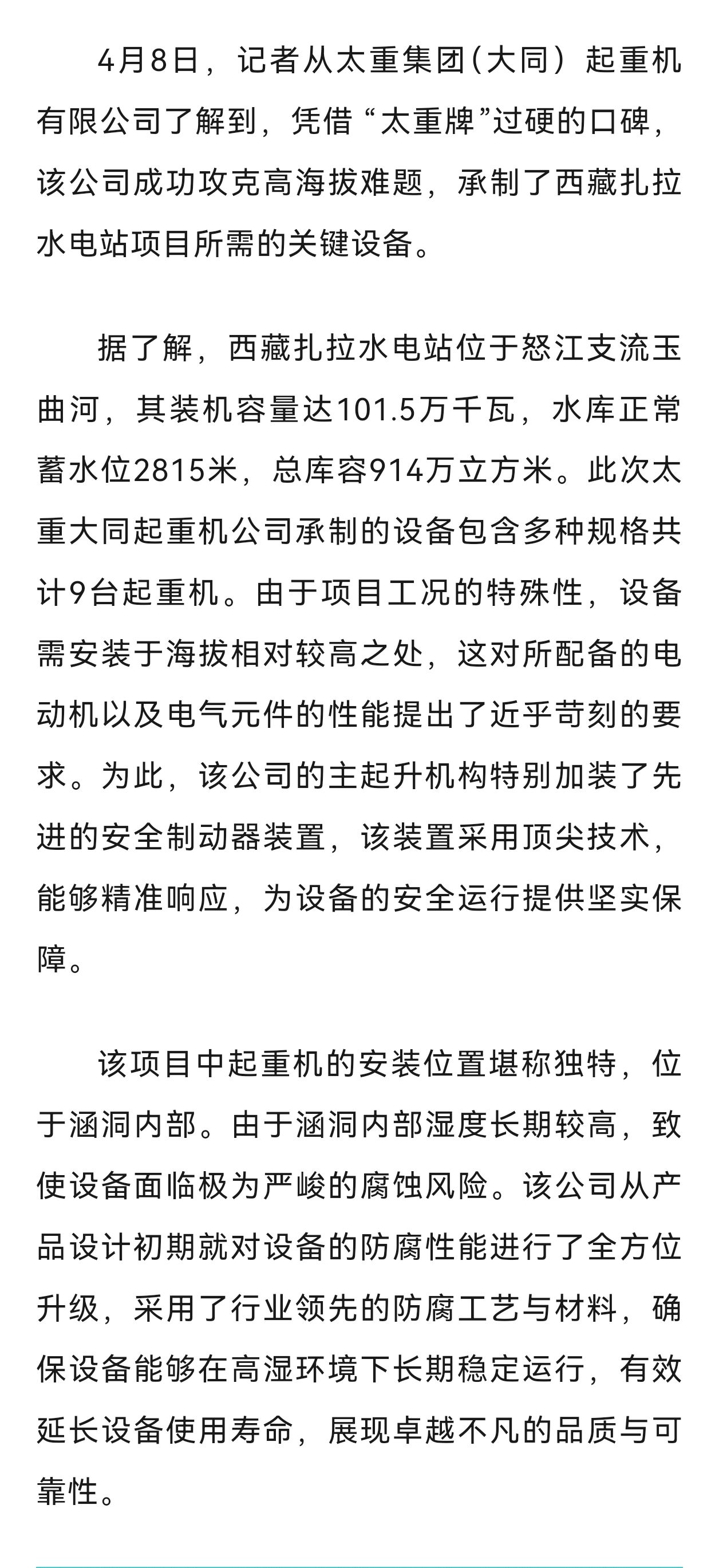 喜訊傳來,振奮人心!太重集團(tuán)(大同)起重機(jī)有限公司佳績不斷,再獲矚目。此前助力攀枝花項(xiàng)目,憑借出色表現(xiàn)受到媒體關(guān)注。4月9日,《大同日報(bào)》頭版再度聚焦報(bào)道,太重集團(tuán)(大同)起重機(jī)有限公司攻克高海拔難題,成功承制了西藏扎拉水電站項(xiàng)目關(guān)鍵設(shè)備承制任務(wù)。