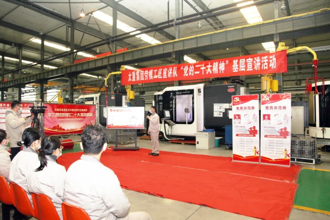 在太重榆液液壓泵分廠車間現(xiàn)場,伴隨著機器的轟鳴聲,黨的二十大精神宣講活動也正在火熱進行中。集團公司“勞模工匠”宣講隊成員,山西省勞動模范、省級勞模創(chuàng)新工作室?guī)ь^人常永紅,正在為他的工友們宣講黨的二十大精神。生產(chǎn)車間既是他每天工作戰(zhàn)斗的地方,也是他宣講黨的創(chuàng)新理論的陣地。他結(jié)合崗位實際談心得、說體會、講感受,推動黨的二十大精神走進基層一線、走進職工心里,唱響新時代奮斗者之歌。